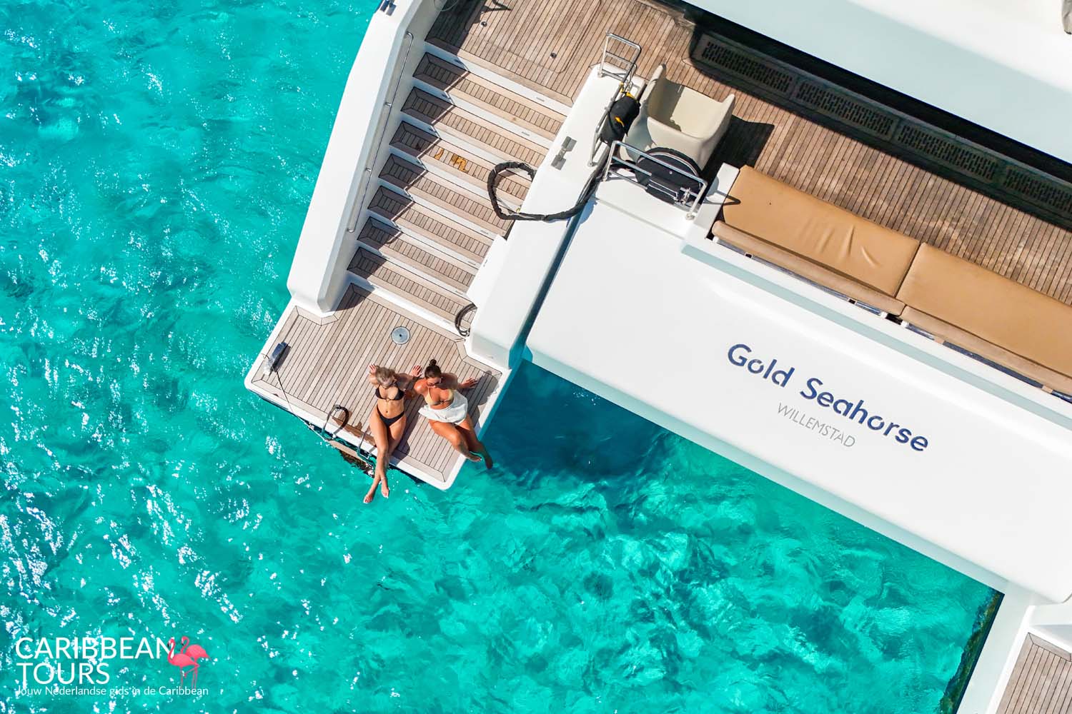 A la hora del almuerzo, el Gold Seahorse atraca en la bahía de Fuik y enciende la parrilla. Mientras el aroma de la barbacoa se mezcla con la brisa marina, te prepararás para un almuerzo relajado. La barra libre premium está lista para bebidas frías, desde refrescos y agua hasta una merecida cerveza o cóctel. Con el plato en el regazo, los pies en la arena o a bordo a la sombra: esta es exactamente la sensación caribeña que buscabas.