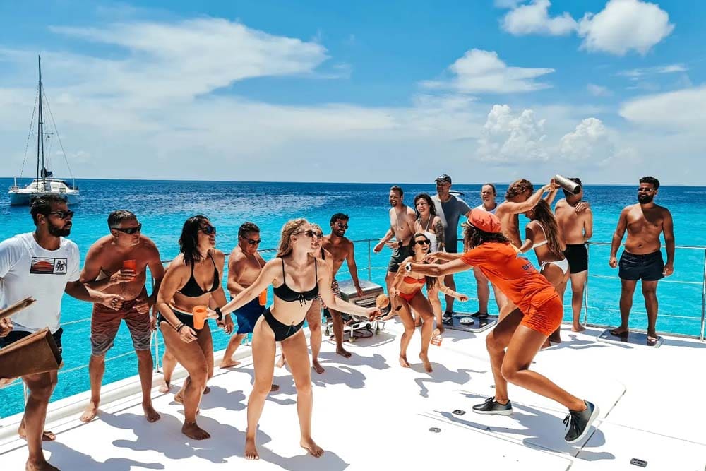 ¿Te apetece un día en el paraíso a pequeña escala? Sube a bordo del Bluefinn TopCat y navega hasta la playa de arena blanca de Klein Curaçao en aproximadamente 1 hora y 45 minutos. Empieza con un delicioso desayuno ligero, atraca junto a las aguas azul turquesa y elige: bucea con tortugas, avista el emblemático faro o relájate en la gran colchoneta flotante. A la hora del almuerzo, te espera una abundante barbacoa, y la barra libre Premium completa tu día en la isla. Gracias al número limitado de plazas (máximo 30), el ambiente es íntimo y relajado, tal y como debería ser tu día de ensueño tropical.