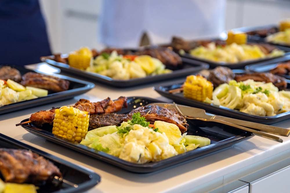 Rond het middaguur staat de bemanning klaar om een uitgebreid BBQ-buffet te serveren met met filet mignon, lendespareribs, kip, aardappelsalade, maïs, groentesalade, stokbrood en garnalenkroepoek!